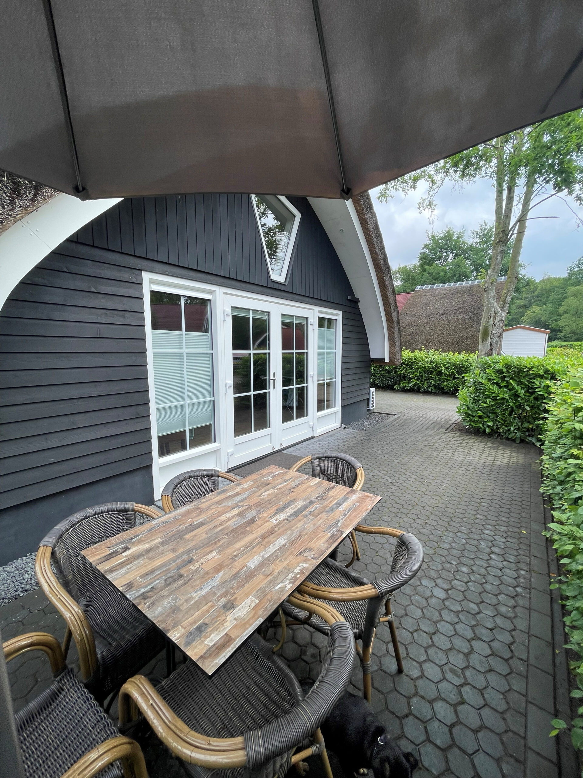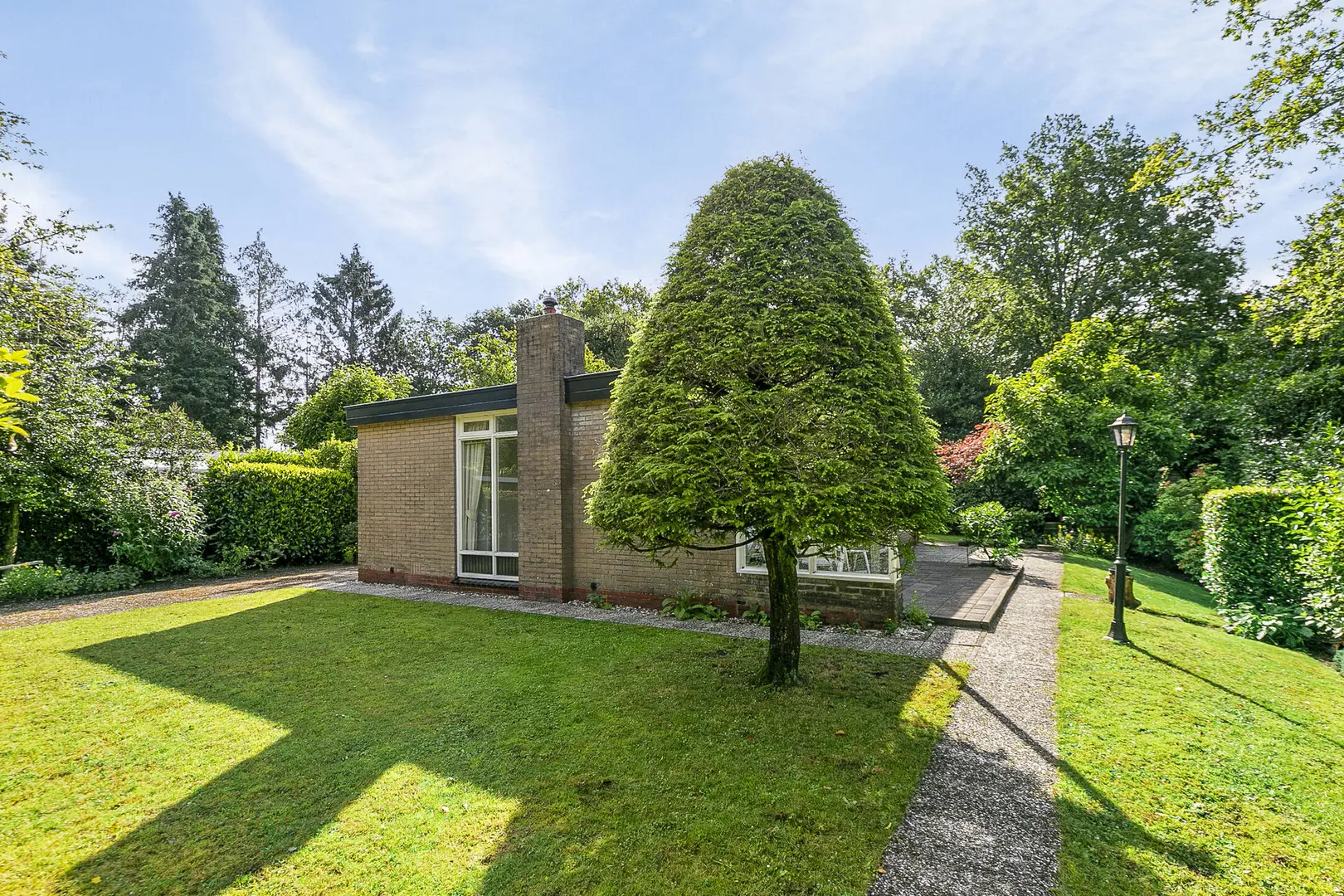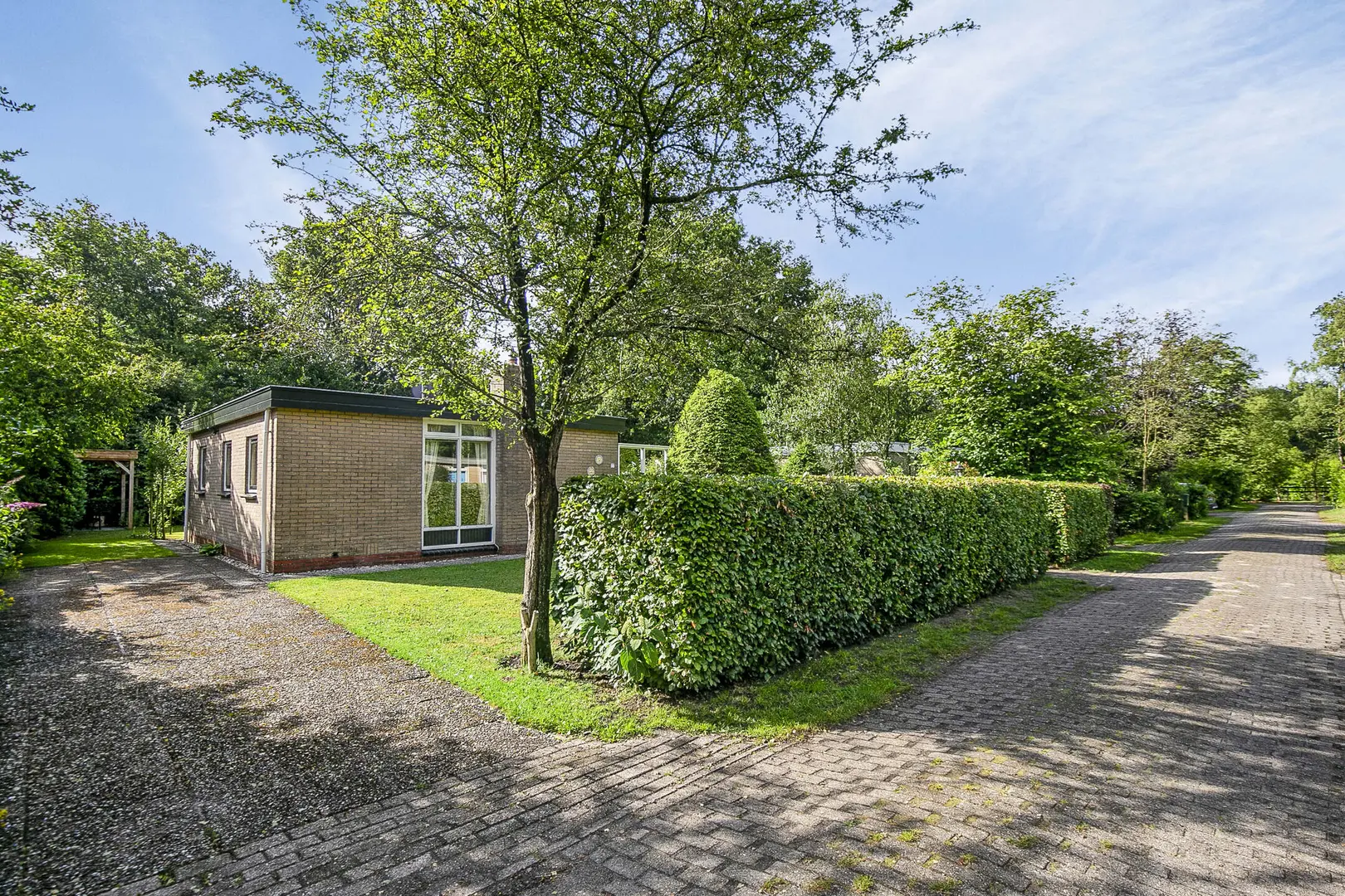 Op een prachtig en bosrijk park gelegen, vrijstaand rietgedekt recreatiewoning (2021) met tuin rondom en een heerlijk zonneterras.