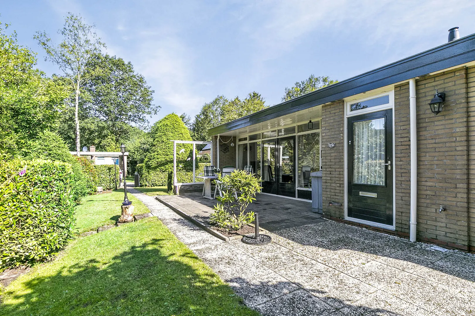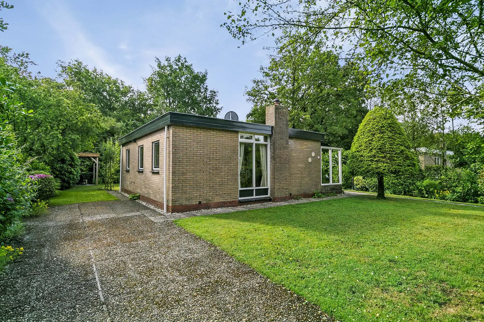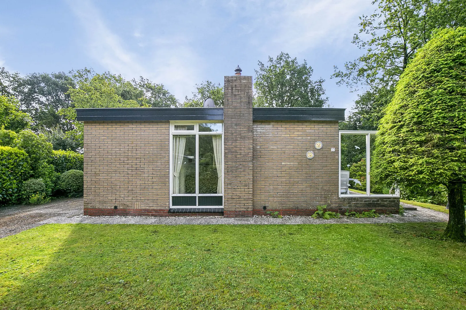Op een prachtig en bosrijk park gelegen, vrijstaand rietgedekt recreatiewoning (2021) met tuin rondom en een heerlijk zonneterras.